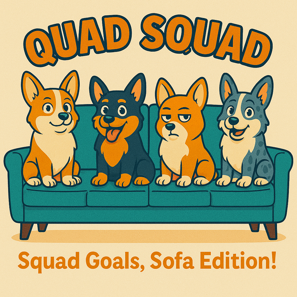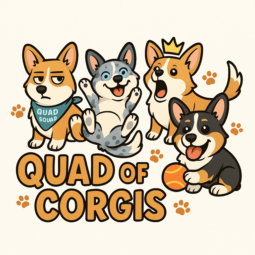 Explore our unique collection of "Quad of Corgis" images, perfect for showcasing your love for these adorable dogs on our hoodies, t-shirts, hats, and more. We specialize in funny and cute Corgi designs that capture the hearts of TikTok fans and beyond.